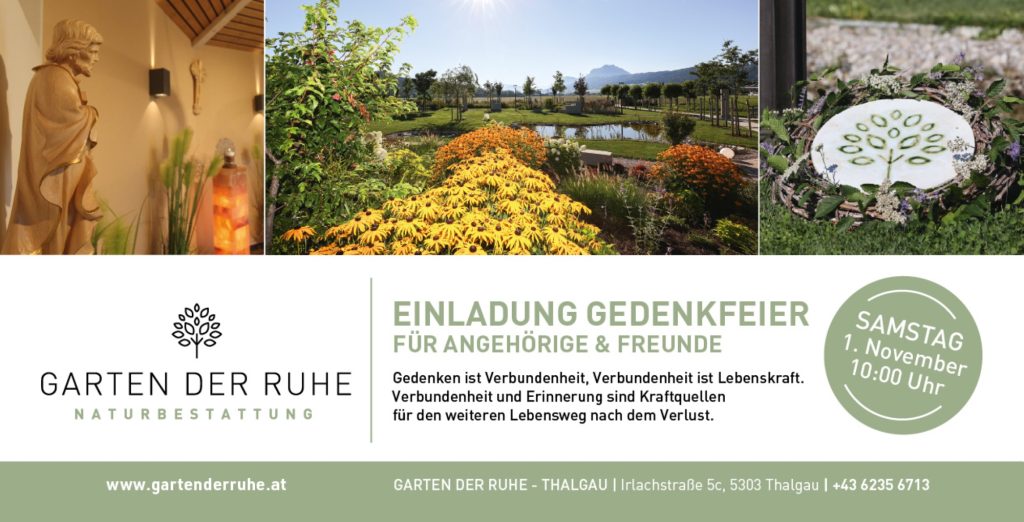 Der Herbst 2019 war geprägt von der Entstehung unserer Naturbeisetzungsfläche, dem Garten der Ruhe. Direkt neben unserem Firmenhauptsitz in Thalgau gibt es nun die Möglichkeit seinen letzten Ruheplatz inmitten eines wunderschön gestalteten Parks zu finden. Der Weg durch den Park führt vorbei an den verschiedensten Pflanzen, Sträuchern und Bäumen unter und neben denen Urnen beigesetzt werden können.